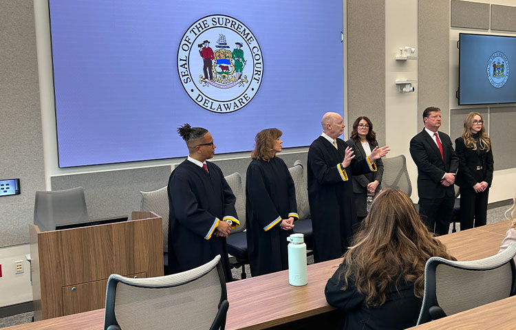 Wilmington University School of Law recently welcomed the Delaware Supreme Court to its campus in North Wilmington, where students had the rare opportunity to watch oral arguments in two actual cases. The experience offered a direct view of the appellate process as it unfolded in real time, with real litigants, active legal questions, and immediate stakes.